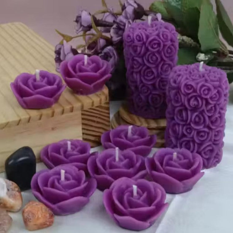 Add calm and charm to any space with this elegant combo of lavender-scented candles in a rich purple hue. Includes 5 rose-shaped floating candles and 5 rose-design pillar candles, all made from smokeless pure soy wax.
