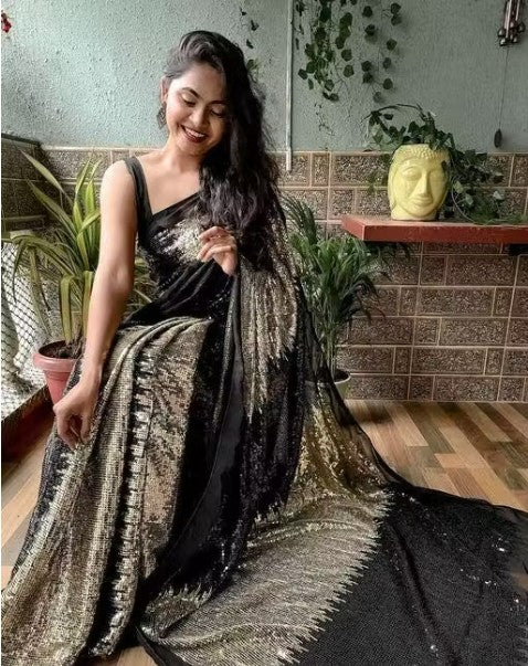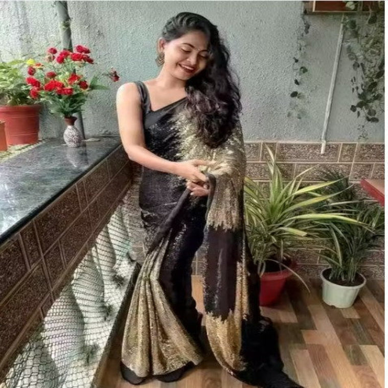 Make heads turn with this trending partywear saree, crafted in soft georgette and embellished with all-over 5mm rainbow sequin embroidery. The rich satin silk blouse piece adds to its elegance, while the black variant shines with a striking 3D sequin effect and fine piping.