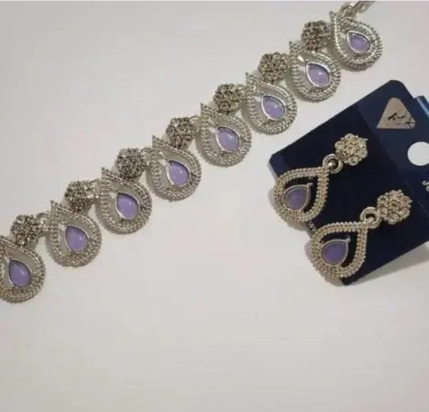 Elegant and eye-catching, this silver-plated necklace and earrings set features a unique purple pistachio hue with premium Monalisa stones and Cubic Zirconia (American Diamonds). Crafted on a durable alloy base with adjustable sizing, it's perfect for special occasions and festive wear.